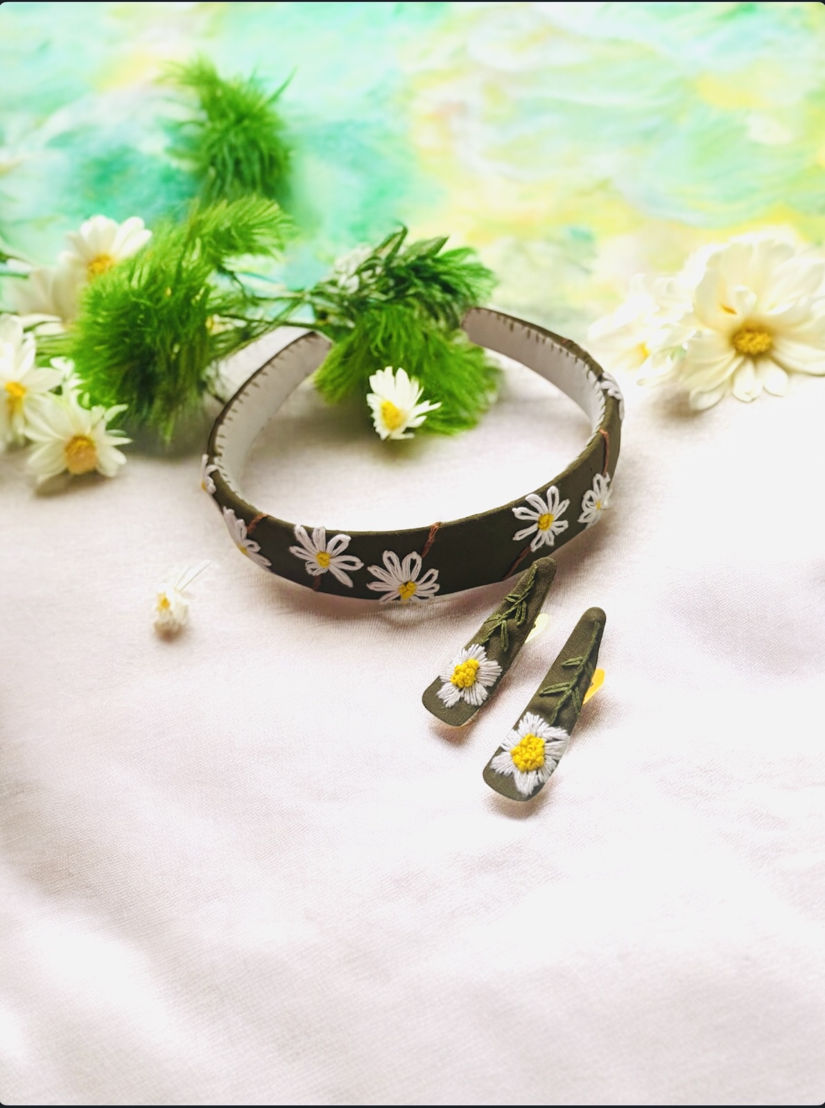 Handmade hair accessory set featuring a floral hair clips and matching headband.